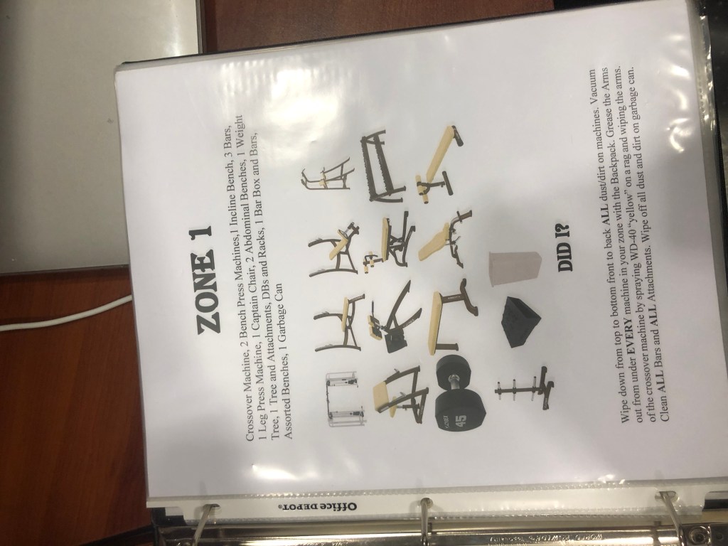 The busiest time for the gym is in the mornings from 5-7 and at night from 4:30-7. At the end of the night, each employee has a zone. A zone is a certain place in the gym that you have to clean. There is a zone book with a list of zones and what you have to clean on that page.